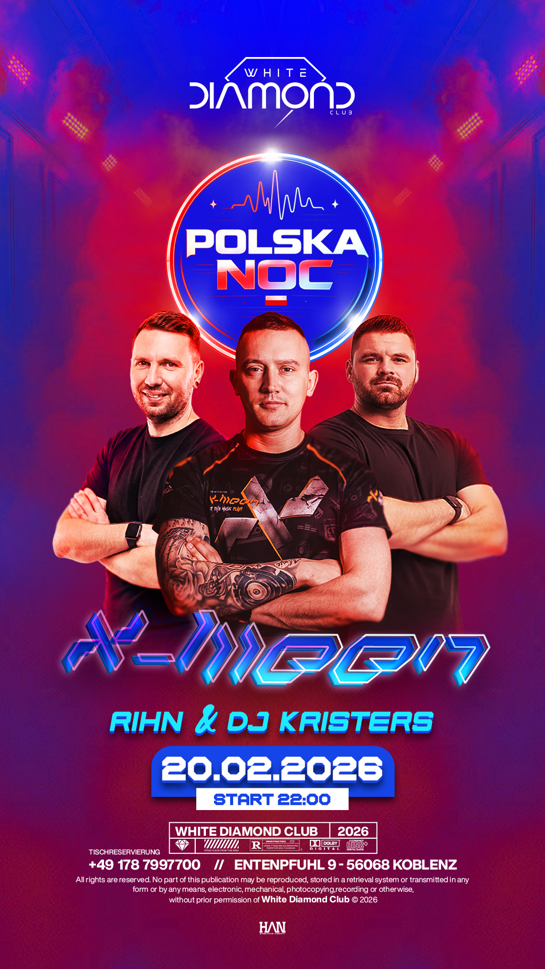 Am 20.02.2026 ab 22 Uhr übernimmt X-MEEN gemeinsam mit RIHN & DJ KRISTERS den White Diamond Club Koblenz.